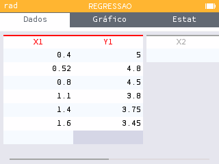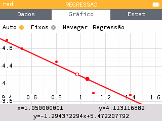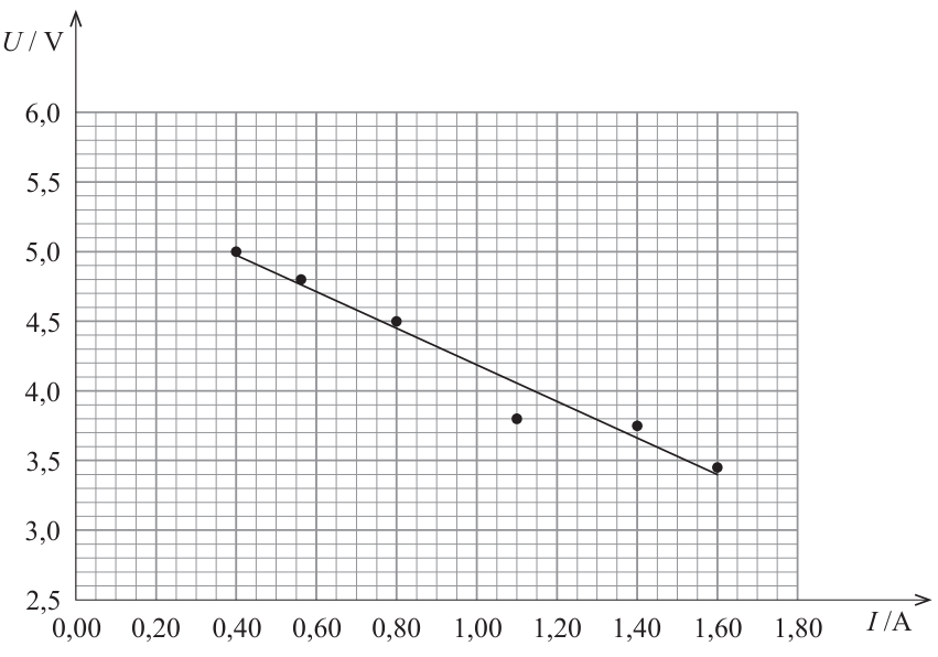 na qual \(\large\varepsilon\) é a força eletromotriz da pilha (ordenada na origem da reta) e \(\large r\) (valor absoluto do declive da reta) a resistência interna da pilha. Assim, basta pegar em dois pontos da reta e determinar a sua equação. \(\left(0,45;4,9\right)\) e \(\left(1,15;4,0\right)\) são dois pontos da reta. Logo, o seu declive é \(\dfrac{4,0-4,9}{1,15-0,45}=\dfrac{-0,9}{0,70}=-1,3\;(U/I)=-1,3\;\Omega \Rightarrow r=1,3\;\Omega\).