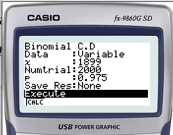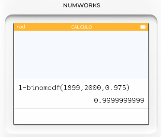 \[P(w\ge1900)=\sum_{i=1900}^{2000} \binom{2000}{i}\times 0,975^i \times 0,025^{2000-i}\]