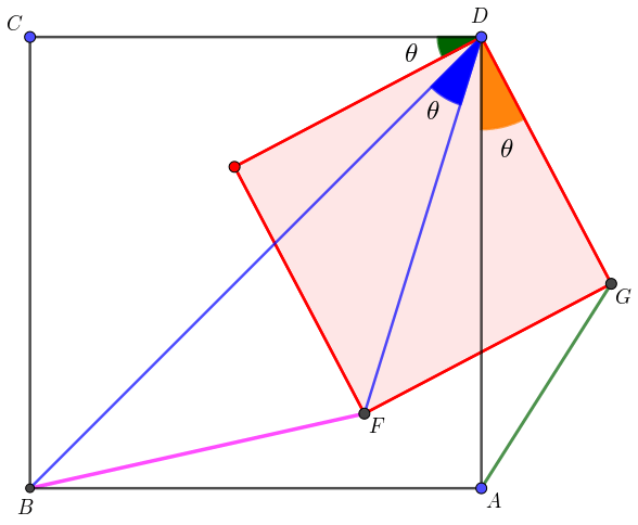 Sejam \(a\) o lado do quadrado \(DEFG\) e \(b\) o lado do quadrado \(ABCD\). As diferentes posições do quadrado menor podem ser vistas como o resultado de rotações de amplitude \(\theta\) em torno do ponto \(D\). Acima temos duas rotações distintas que resultam em diferentes comprimentos para \(\overline{AG}\) e \(\overline{BF}\). No entanto, a razão entre estes é sempre constante para qualquer rotação \(\theta\).