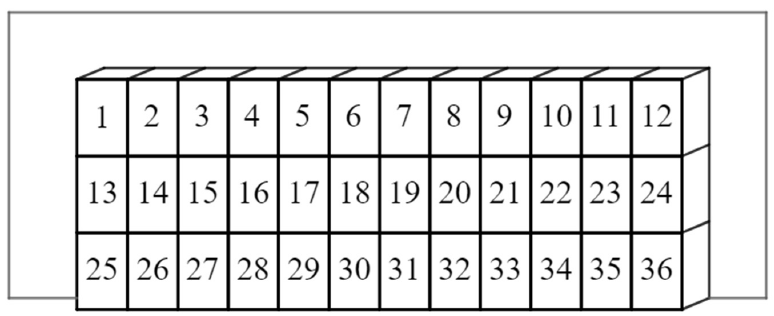 dispostos em três filas com \(12\) cacifos em cada fila, numerados