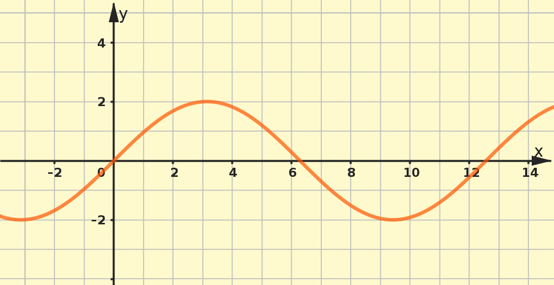 A figura mostra o gráfico \(G_g\) da função \(g\) definida em \(\R\) por \({g ( x ) = 2 ⋅ \sin \left( \frac{1}{ 2} x \right)}.\)