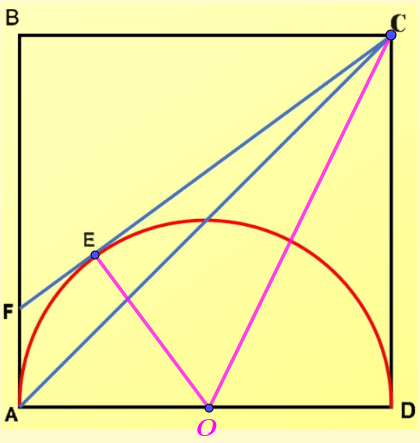 Como \(E\) é o ponto de tangência de \(CF\) à semicircunferência, \(EO\perp CF\), em que \(O\) é o centro da semicircunferência. Assim, \(\triangle[EOC]\) é retângulo em \(E\). Pelo Teorema de Pitágoras,