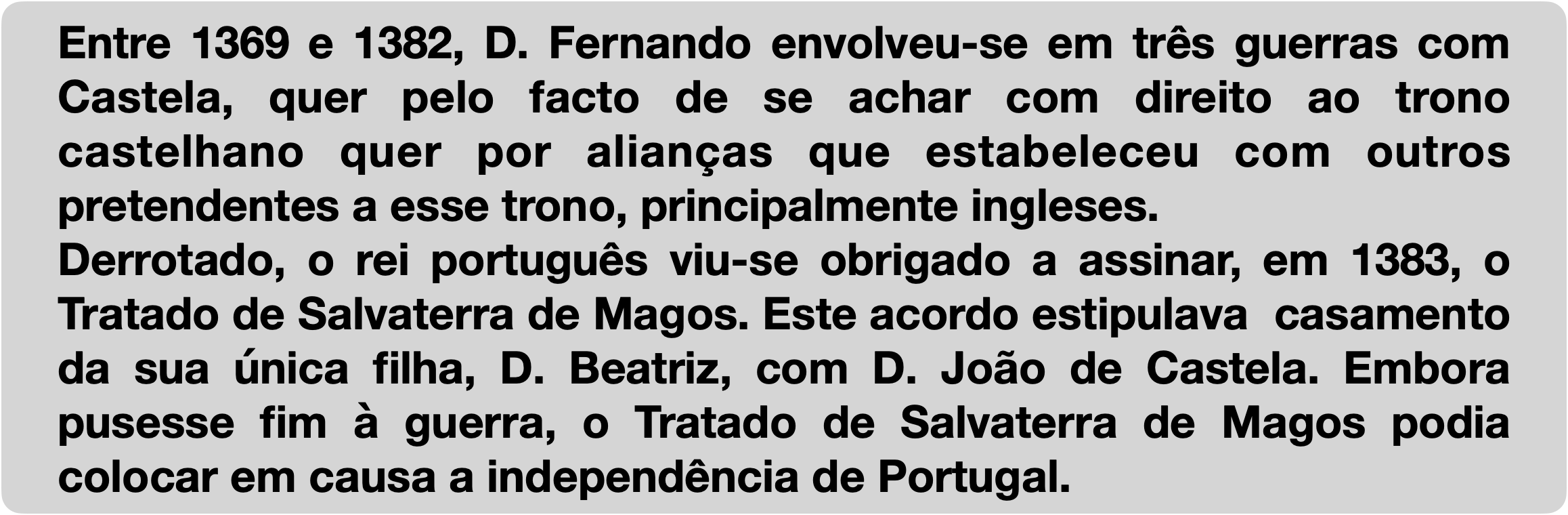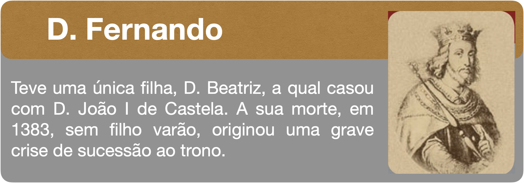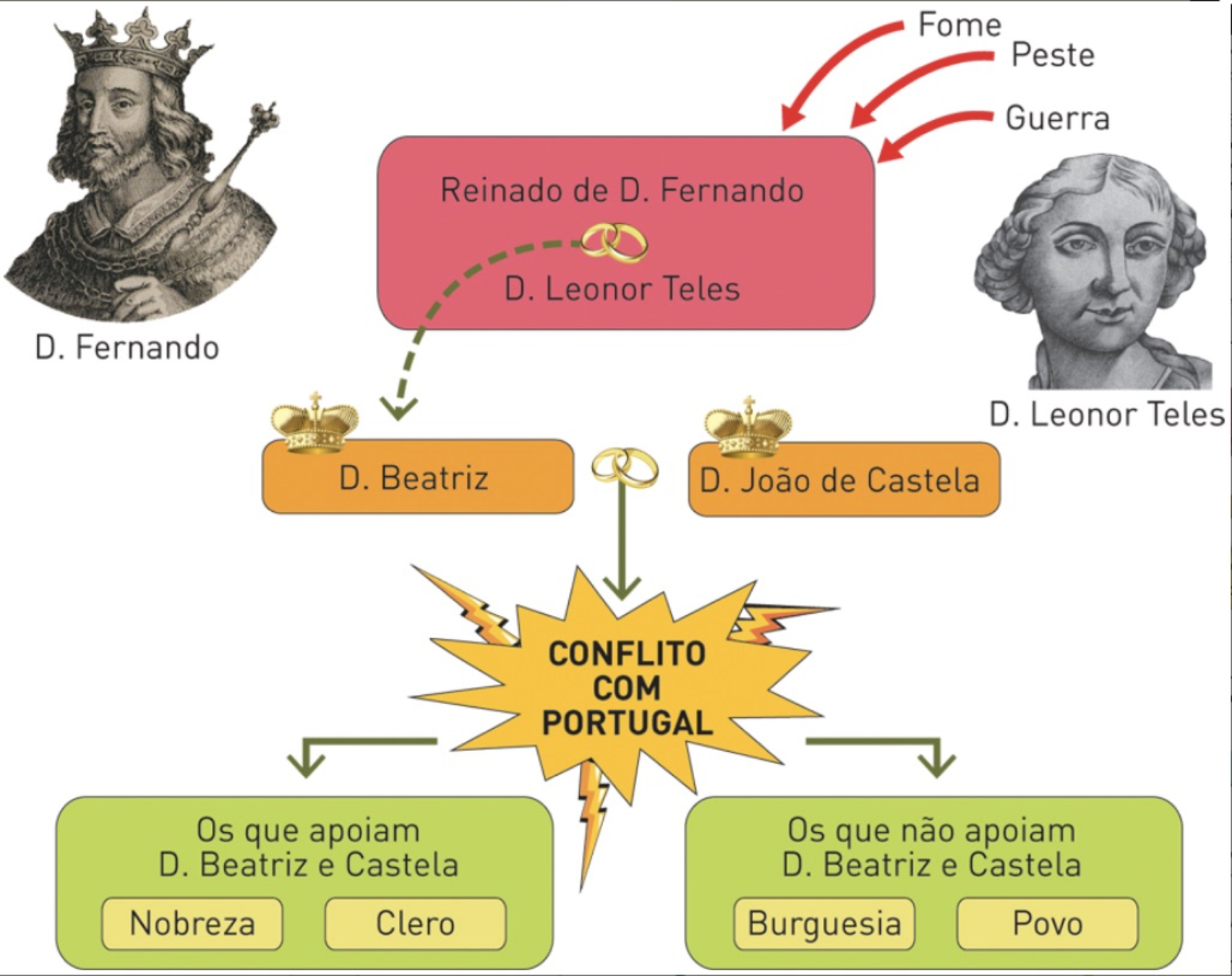 D. Fernando envolveu-se em guerras com D. João I de Castela, achava-se com o direito de reclamar para si o trono Castelhano. Mas saiu derrotado. Para selar a paz entre ambas nações assinou o tratado de Salvaterra de Magos, dando sua única filha, D. Beatriz, em casamento com o rei Castelhano. D. Fernando morre sem herdeiro varão... o que sucede?