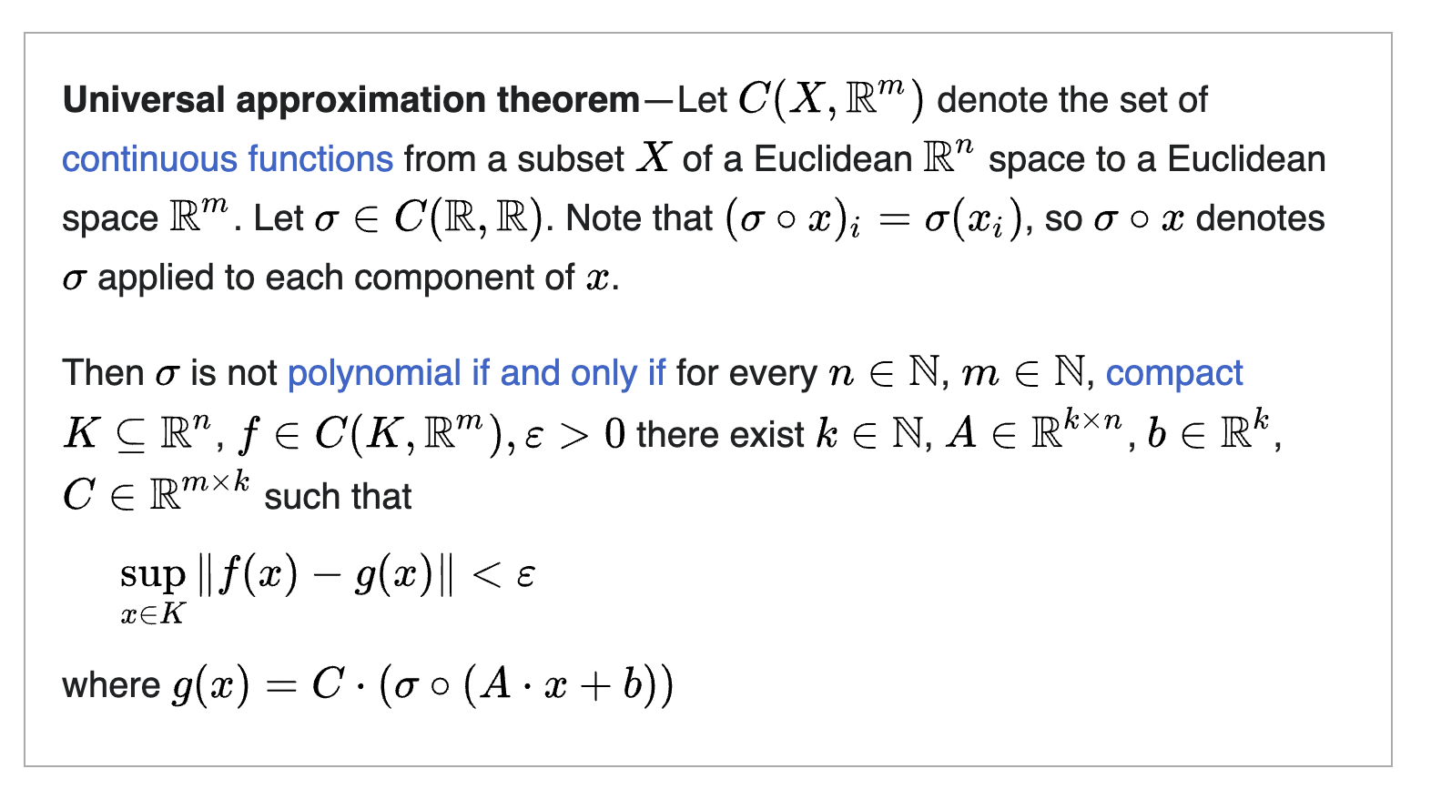 "Single hidden layer can be used to approximate any continuous function to any desired precision"