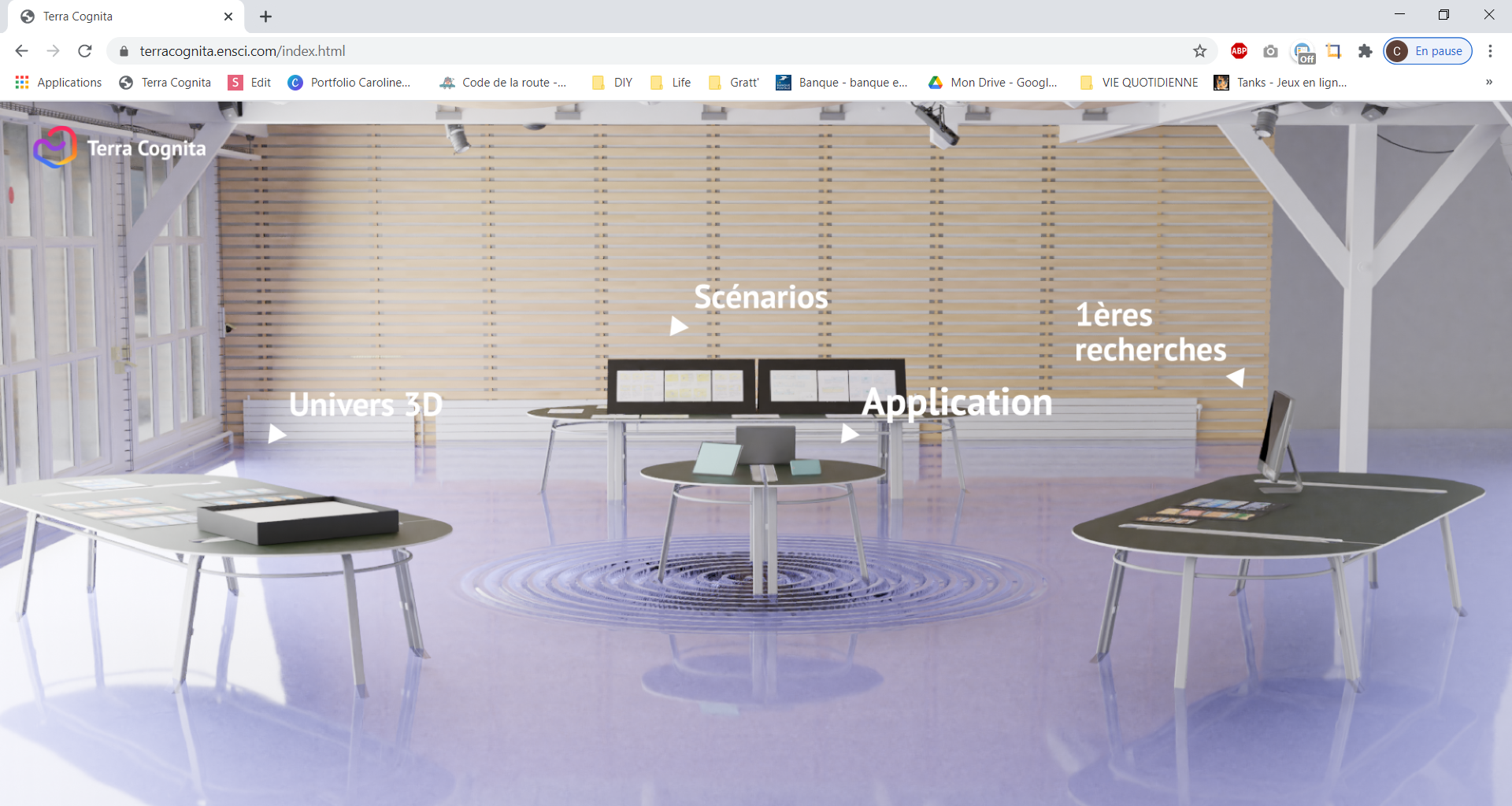 Je soutiens mon diplôme pendant le second confinement. Une partie du jury et l'ensemble du public se trouvent alors à distance. Pour faciliter le suivi de la présentation, je propose une version web de ma scénographie de diplôme, accessible ici : https://terracognita.ensci.com/