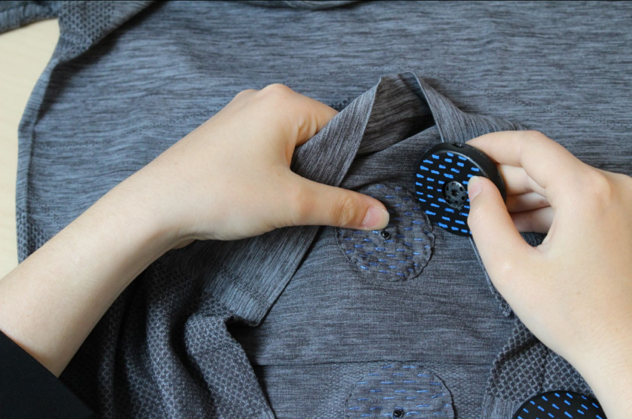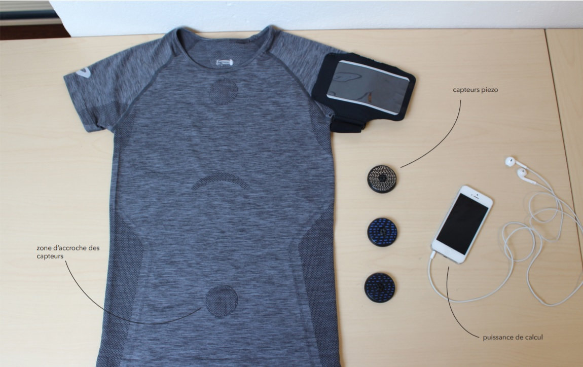 Avec l'aide d'une sophrologue (spécialiste de la respiration), nous concevons un t-shirt capable de détecter la respiration du coureur. Trois capteurs pression, placés sur des zones stratégiques du torse, mesurent et identifient le type de respiration. Transmises à une application, ces données permettront d'assister le coureur à trois étapes clé.