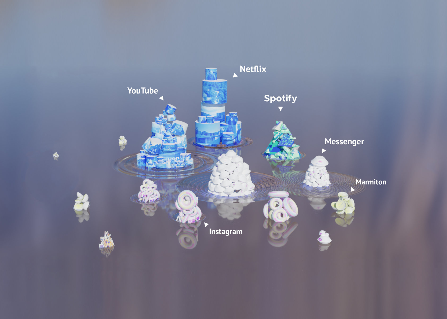 Des animations viennent compléter l'aperçu. Les vagues montrent le pouvoir d'attraction des plateformes sur l'usager. Leur amplitude et leur fréquence dépendent de ses habitudes de navigation.