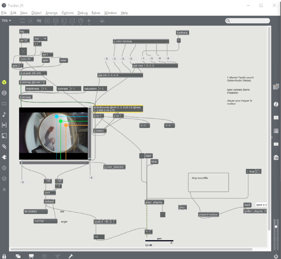 Je programme les interactions via Processing et Max/MSP dont on voit un aperçu ici.