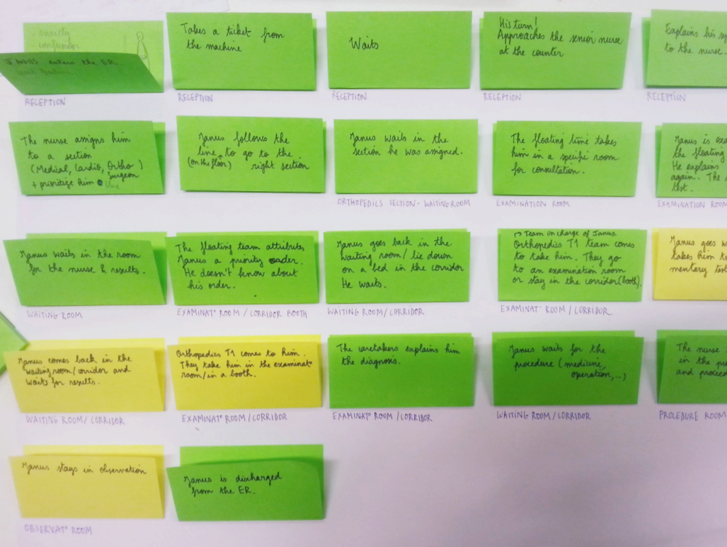 Après une enquête de terrain auprès des patients et du personnel médical, nous identifions différents points de friction. En particulier, les patients connaissent mal le parcours de soin qu'ils devront suivre. Ils ont ainsi du mal à se repérer dans ce parcours, mais aussi dans l'espace des urgences, composé de plusieurs services avec chacun leurs propres salles d'attente. De plus, les temps d'attente, souvent longs, provoquent beaucoup d'anxiété.