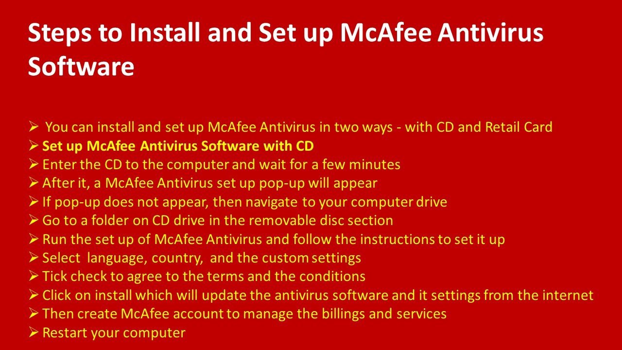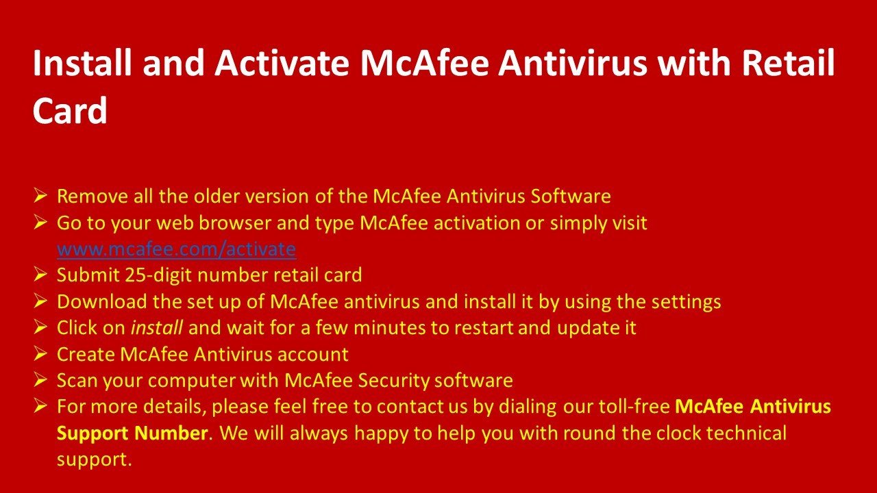 Get the support to Setup and Install McAfee Antivirus Call 1-888-909-0535 McAfee Technical Support Phone Number or follow the steps to Install and Setup McAfee Antivirus. http://www.antivirussupportnumberusa.com/blog/setup-install-mcafee-antivirus/