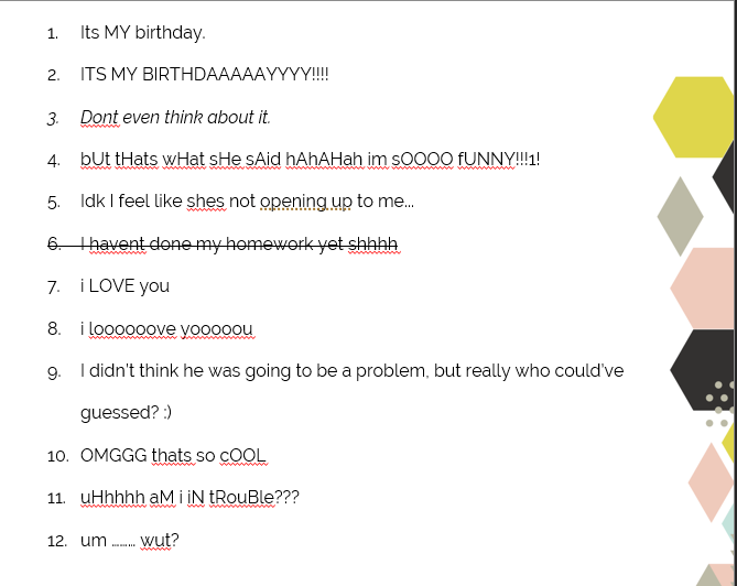 Review the selected passage. As a group, re-write the passage using typographical tone of voice indicators (ALL CAPS, ~*sarcasm tildes*~, e m p h a t i c spacing, and/or other typographical features that may have not been included in this discussion