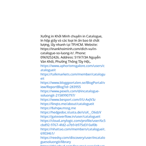 Website: https://inankhoiminh.com/dich-vu/in-catalogue-so-luong-it/. Bạn cần Dịch vụ in nhanh số lượng ít cho Catalogue? Khởi Minh đảm bảo in đẹp, chuẩn màu và giao hàng đúng hẹn trên toàn quốc. Phone: 0969252426. Address: 519/7/3A Nguyễn Văn Khối,
