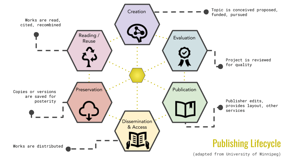 "the system through which research and other scholarly writings are created, evaluated for quality, disseminated to the scholarly community, and preserved for future use. The system includes both formal means of communication, such as publication in peer-reviewed journals, and informal channels, such as electronic listservs" - ACRL