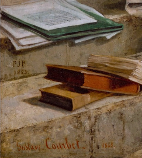 La signature est juxtaposée à l’inscription dédiée au modèle-sujet de l’œuvre : sur la marche où Proudhon est assis, se lisent ses initiales en lettres capitales et la date « historique » (« P.J.P. 1853 »).