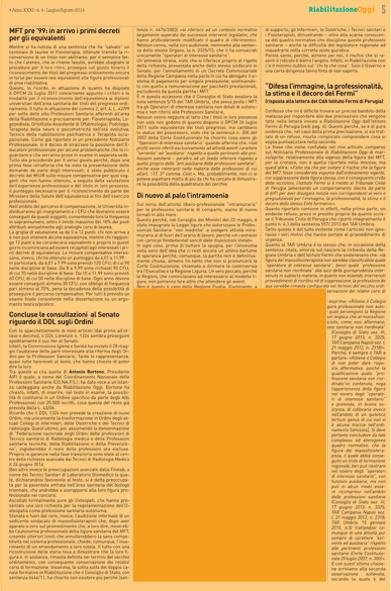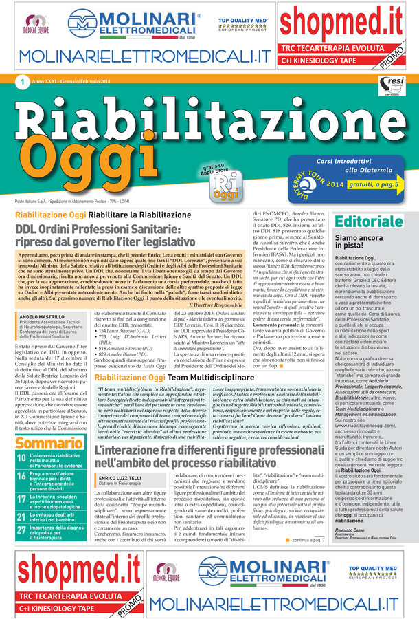 Riabilitazione Oggi, a technical-scientific Italian magazine, in over thirty years experience on the market, has followed thousands of physiotherapists in their profession. From the first issue of 2014, Riabilitazione Oggi, has changed ownership but will maintain the same editorial line, with historical section (such as Professional News, Neurosciences, Orthopedics, etc..), but also with new features dedicated to particularly topical (Management and Communications Team multidisciplinary, internet, Sport, physical therapies instrumental, etc.).