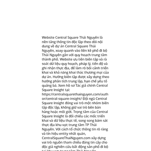 Website: https://centralsquarethainguyen.com/. Website Central Square Thái Nguyên là nền tảng thông tin độc lập theo dõi nội dung về dự án Central Square Thái Nguyên, xoay quanh vào liền kề phố đi bộ Thái Nguyên gắn với quy hoạch trung tâm thành