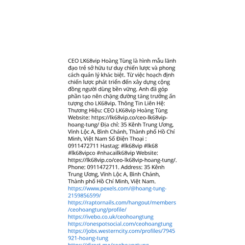 Website: https://lk68vip.co/ceo-lk68vip-hoang-tung/https://lk68vip.co/ceo-lk68vip-hoang-tung/ CEO LK68vip Hoàng Tùng là hình mẫu lãnh đạo trẻ sở hữu tư duy chiến lược và phong cách quản lý khác biệt. Từ việc hoạch định chiến lược phát triển đến xây dựng cộng đồng người dùng bền vững. Anh đã
