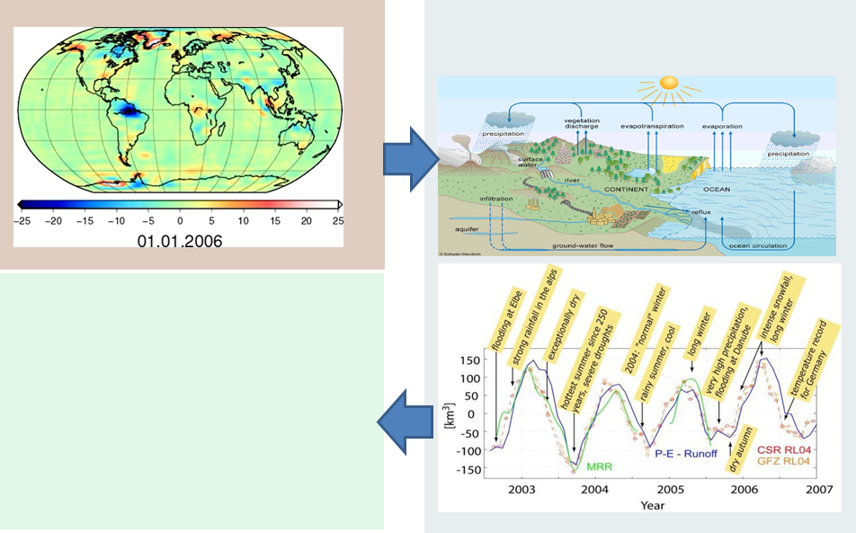 Gerçekte; okyanus hareketleri, atmosferik ve kara buz kütleleri ve bu bileşenler arasındaki kütle değişimleri hidrolojik rezervuarlar ve su depolarındaki değişimlere yol açar.