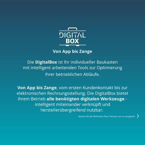 Von App bis Zange, vom ersten Kundenkontakt bis zur elektronischen Rechnungsstellung. Die DigitalBox bietet Ihrem Betrieb alle benötigten digitalen Werkzeuge - intelligent miteinander verknüpft und herstellerübergreifend nutzbar.