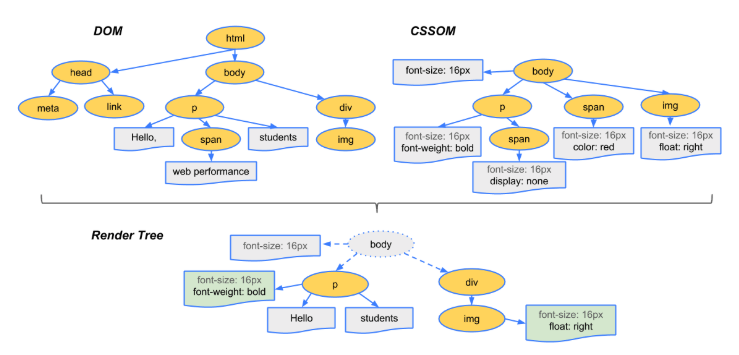 - DOM 및 CSSOM을 결합하여 렌더링 트리를 형성합니다.