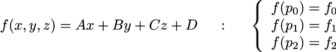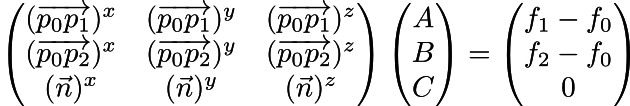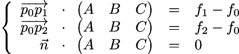 The dot product between vectors (p2-p0) and (ABC) is equal to f2-f0, and the same applies for (p1-p0)