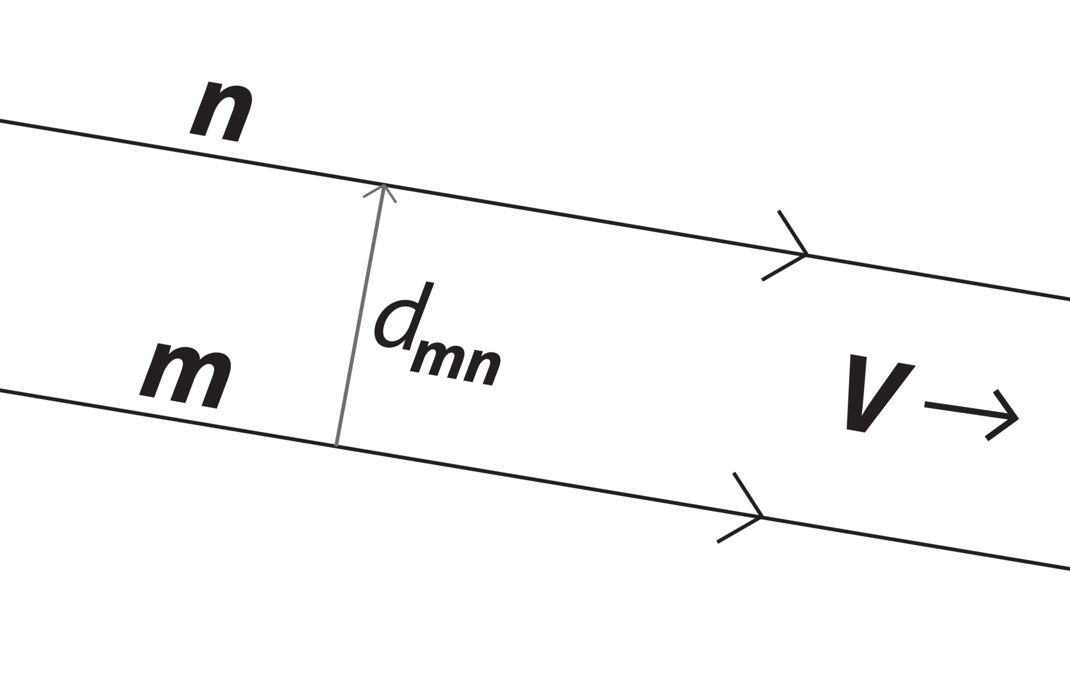 Example: \(\mathbf{m} = \mathbf{m}(\mathbf{n}\mathbf{n}) = (\mathbf{m}\mathbf{n})\mathbf{n} \) since for a proper line \(\mathbf{n}^2 = 1\) and associativity. This leads to a decomposition of \(\mathbf{m}\) with respect to \(\mathbf{n}\):
