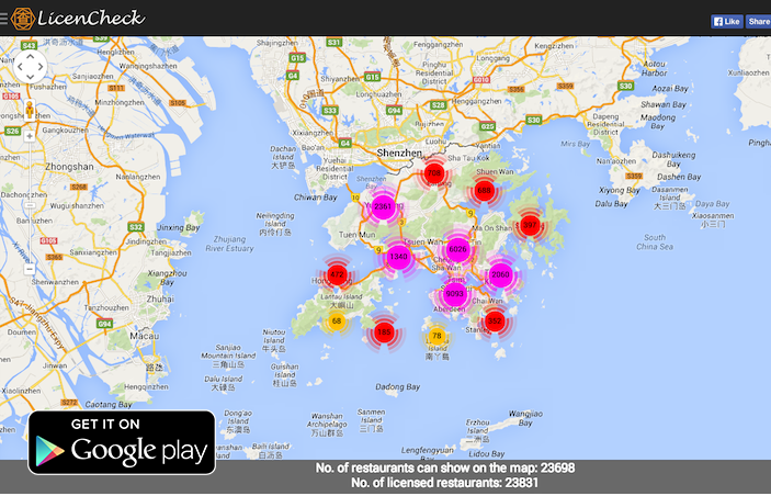 - LicenCheck (an Android and web app that provides a map view of Hong Kong with markers locating all licensed restaurants)