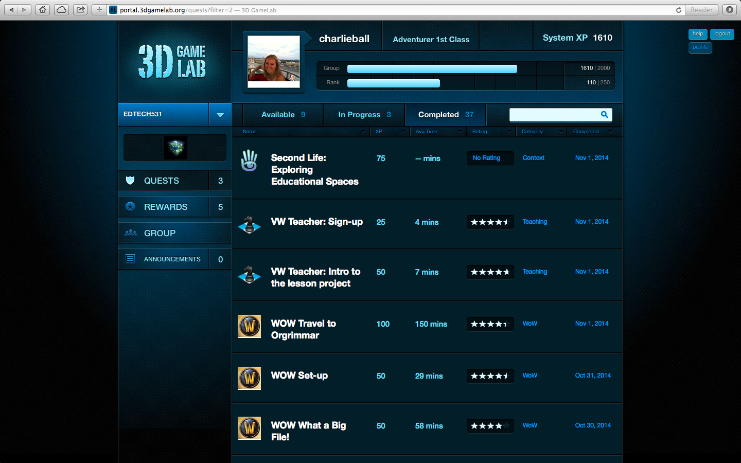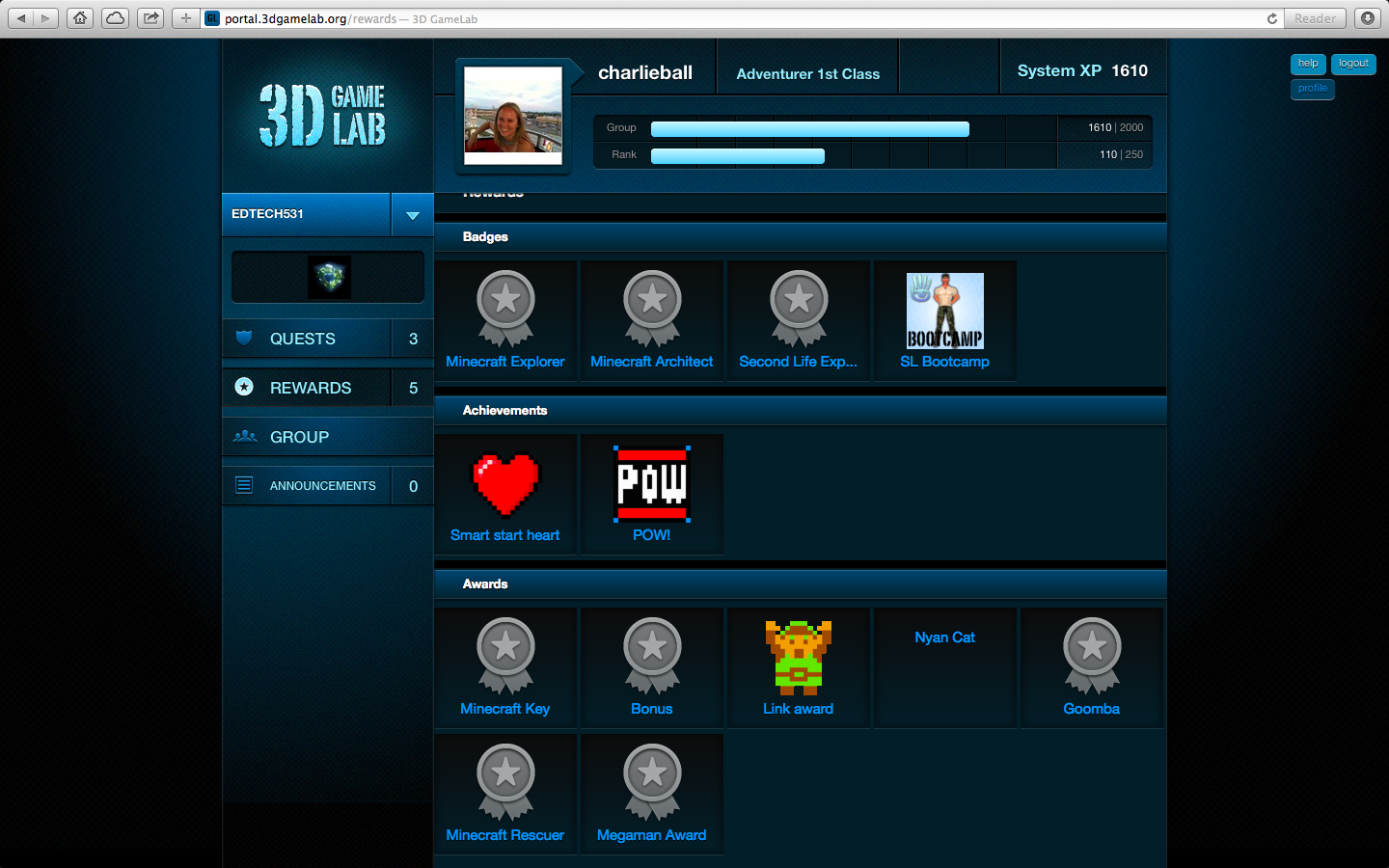 Blowing up the gradebook. Retrieved from https://www.youtube.com/watch?v=atMlkVgzx-Y Bolokhova, E., & Nonkovic, Filip. (2014). A look at gamification: the shape of things to come. Parenting. Retrieved from http://www.parenting.com/blogs/mom-congress/elina-bolokhova-and-filip-nonkovic/gamification. Elliott, D. (2014). Levelling the playing field: Engaging disadvantaged students through game-based pedagogy. Australian Journal Of Language & Literacy, 37(2), 34-40. Johnson, L., Adams Becker, S., Estrada, V., and Freeman, A. (2014). NMC Horizon Report: 2014 K-12 Edition. Austin, Texas: The New Media Consortium. Peggy Sheehy-WOW in school: the hero's journey. Retrieved from https://www.youtube.com/watch?v=LFenJVg_4YM&feature=youtu.be Shapiro, Jordan. (2014). Here's why we need video games in every classroom. Forbes. 3D Gamelab-The power of quest based learning. (2013). Retrieved from https://www.youtube.com/watch?v=fwk0oCMWFzY