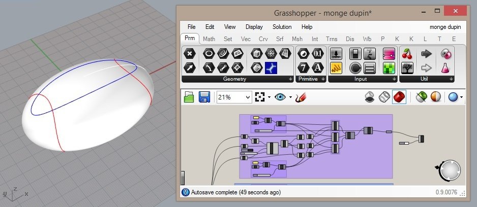 Monge descobriu um método brilhante, que agiliza o desenho das projeções das linhas principais de curvatura de um elipsoide.