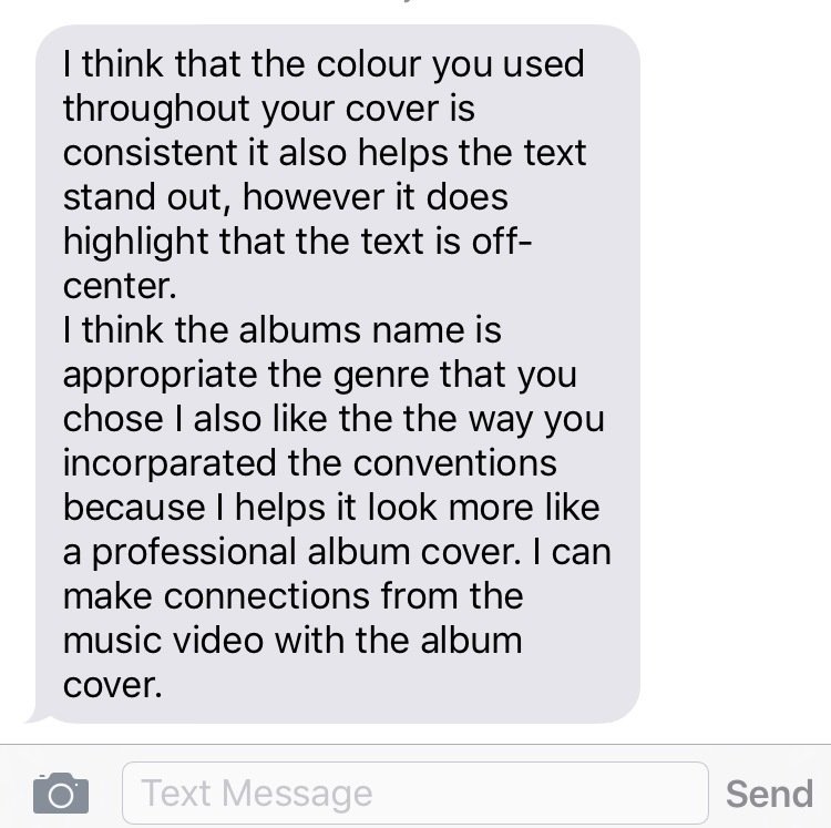 with my ancillary product my feedback i asked my target audience what went well? what did not ? and other comments , they said the font was appropriate and related well with my theme. They can relate to my album cover and advert. I only had one negative comment as i swayed them to pursue to find a bad feature with my product so that i can then improve them so it fulfills all the conventions of my genre, i feel i have done that as i then improved on album cover so that it would be within all the aspects of the conventions.