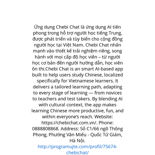 Website: https://chebichat.com.vn/. Chebi Chat là app trí tuệ nhân tạo đi đầu trong hỗ trợ người học tiếng Trung, được phát triển và tùy biến cho cộng đồng người học tại Việt Nam. App này tập trung vào tùy chỉnh lộ trình học, song hành với người dùng