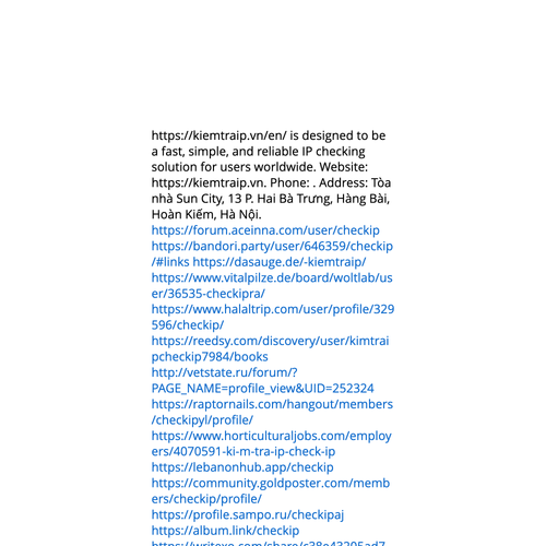 Website: https://kiemtraip.vnhttps://kiemtraip.vn https://kiemtraip.vn/en/ is designed to be a fast, simple, and reliable IP checking solution for users worldwide. Phone: . Address: Tòa nhà Sun City, 13 P. Hai Bà Trưng, Hàng Bài, Hoàn Kiếm, Hà Nội.