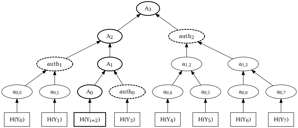 - Authentication path encodes (binary expansion of) \( i\in\Big\{0,1,\ldots,n-1\Big\} \) and thus proves \( f(i)=y_i \)