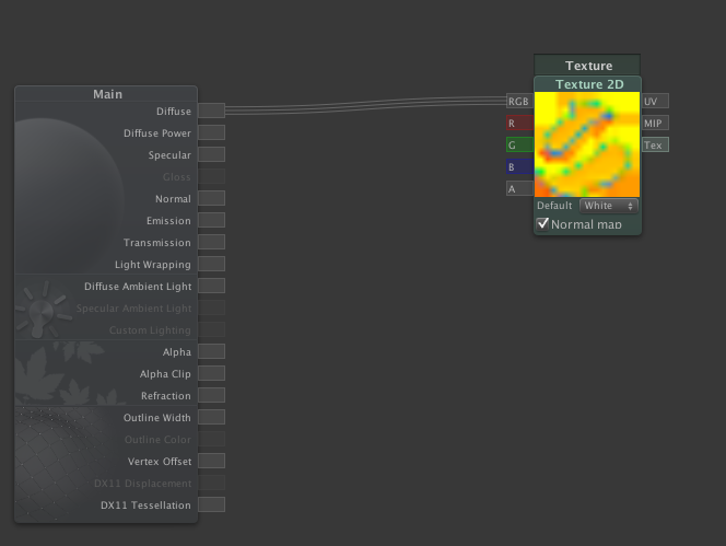 Shader "Example/Diffuse Texture" {Properties { _MainTex ("Texture", 2D) = "white" {} } SubShader { Tags { "RenderType" = "Opaque" } CGPROGRAM #pragma surface surf Lambert struct Input { float2 uv_MainTex; }; sampler2D _MainTex; void surf (Input IN, inout SurfaceOutput o) { o.Albedo = tex2D (_MainTex, IN.uv_MainTex).rgb; } ENDCG } Fallback "Diffuse" }