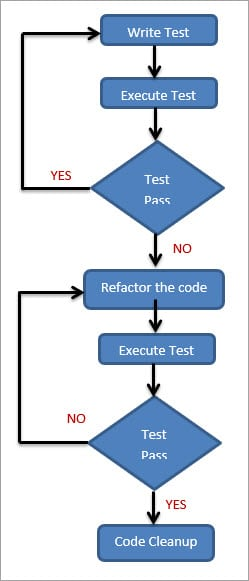 Test-driven development (TDD) is a software development process that relies on the repetition of a very short development cycle: requirements are turned into very specific test cases, then the code is improved so that the tests pass.