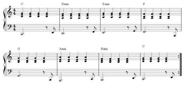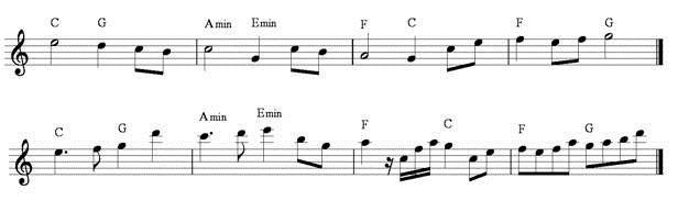 相對音名(唱名):1 - 5 - 6m - 3m - 4 - 1 - 4(2m) - 5