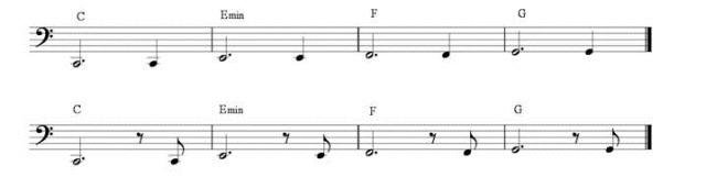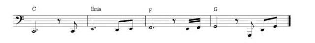 2. 在第4拍彈奏經過音,連接至下一個和絃的根音