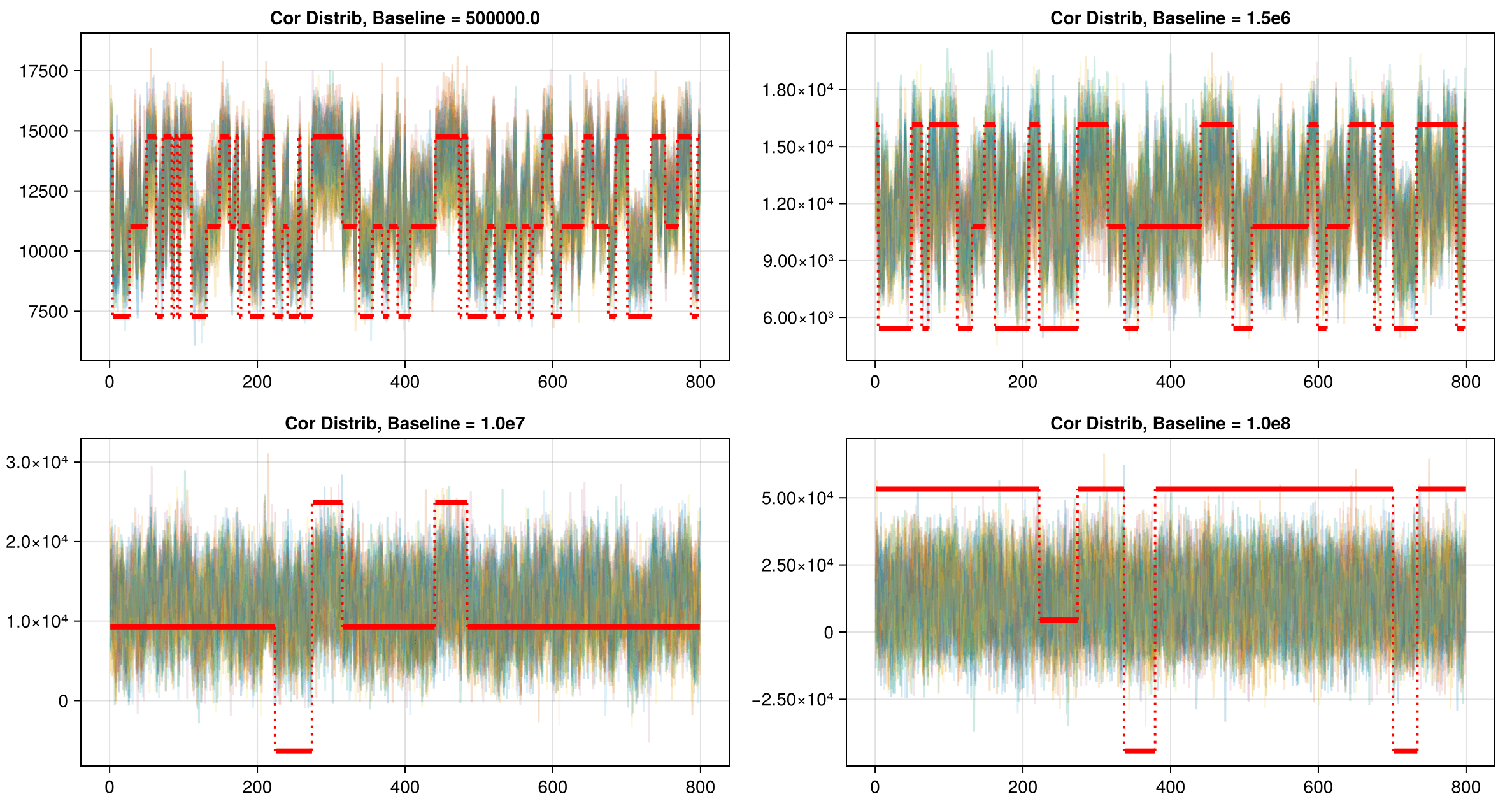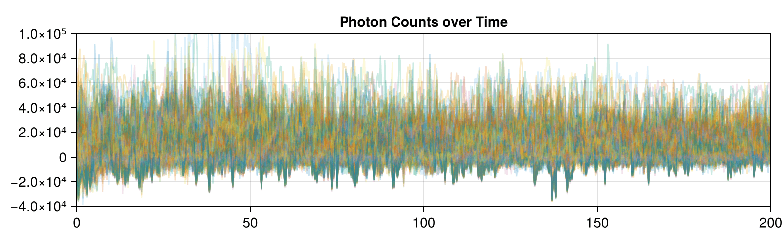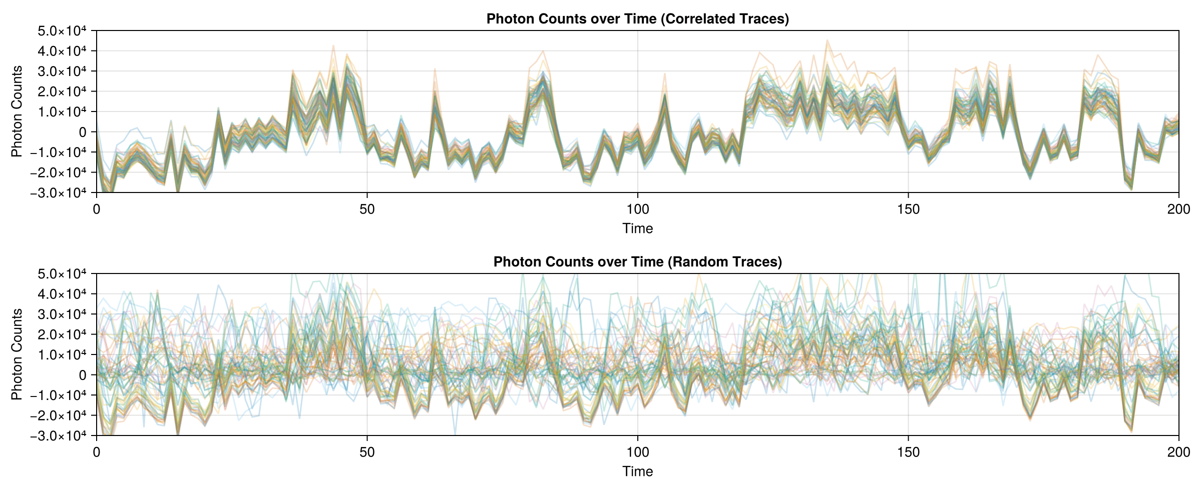 The correlated traces in Dataset 02 are visible even when plotting the data with high transparency: each line in the correlated set stacks to form a darker line.