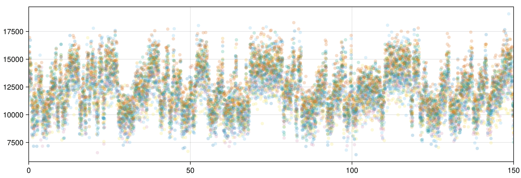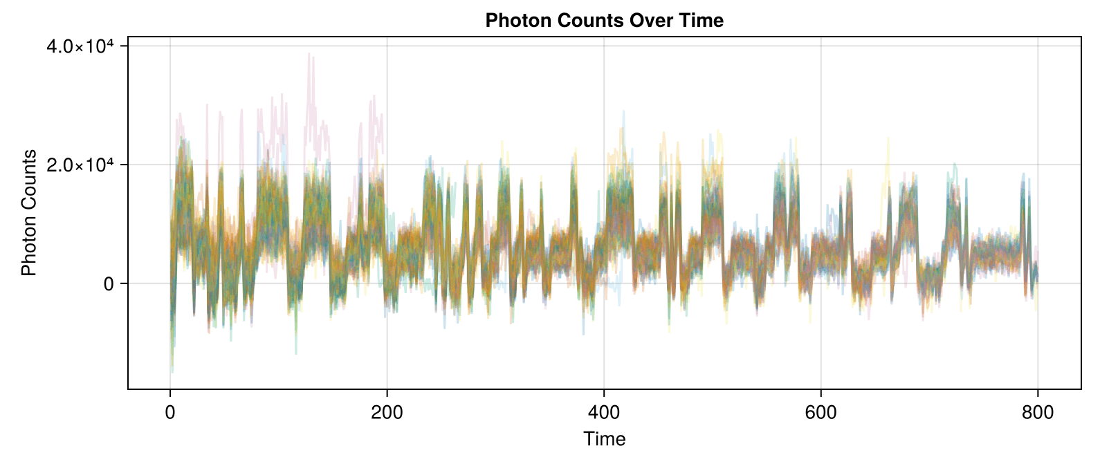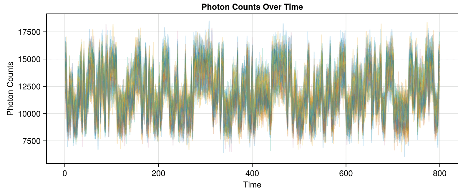 The correlated traces in Dataset 02 are visible even when plotting the data with high transparency: each line in the correlated set stacks to form a darker line.