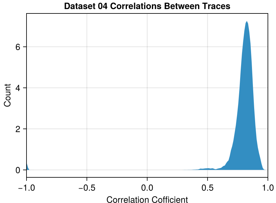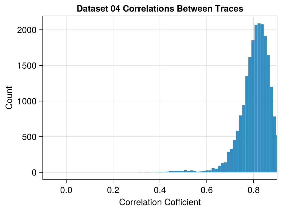 Even though the correlations in Dataset 04 are on average much higher, the largest set correlated mutually at > 0.92 only has 9 traces.