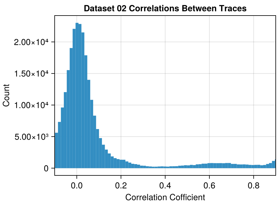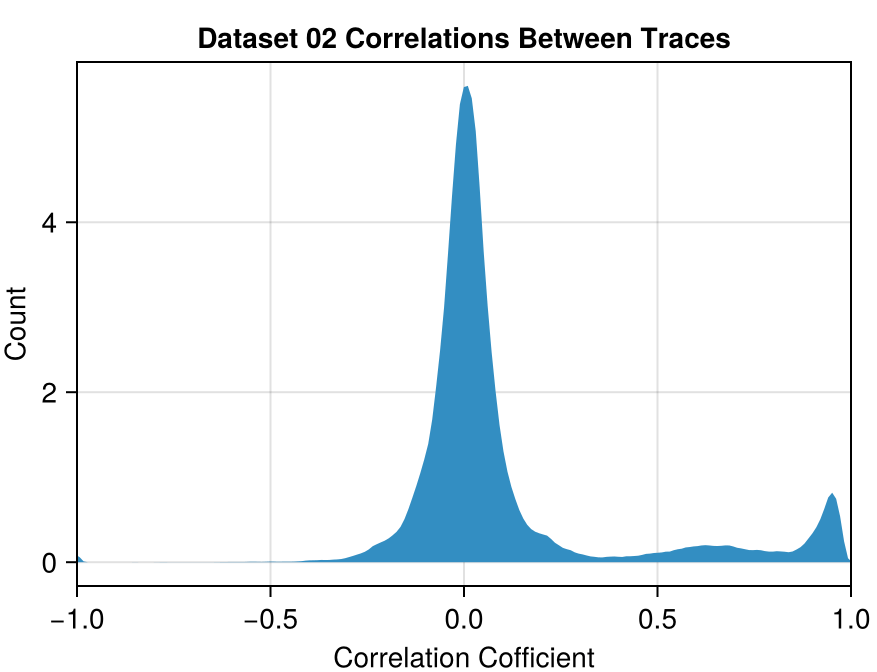 In Dataset 02, there is a set of 67 traces where all traces in this set are correlated with each other at a coefficient of > 0.92.