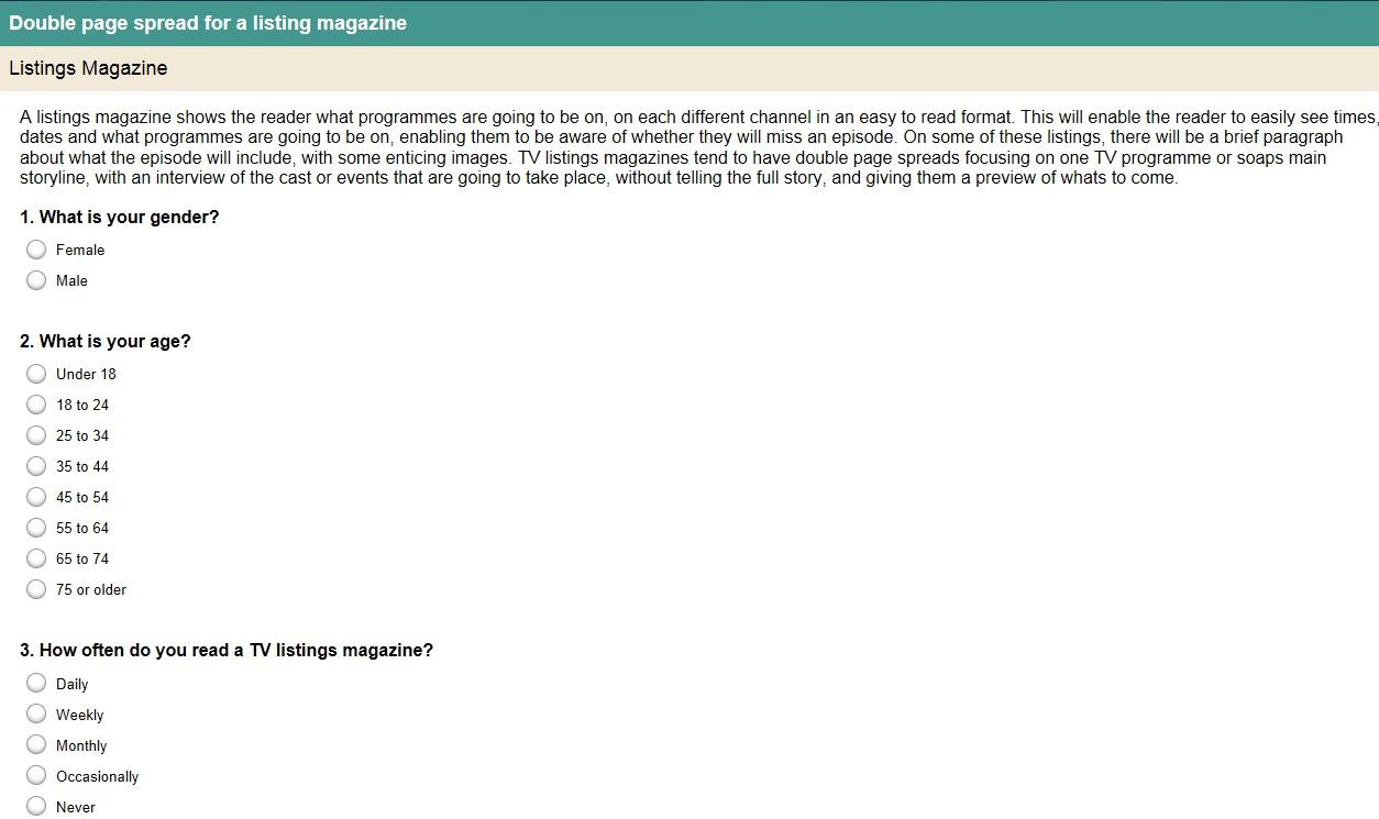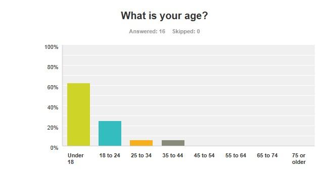 From the twitter and Facebook survey links, a large number of the people who took the survey were under 18, but we know this is due to the dominance over the internet that the younger generation have, and although this is useful to some extent, we will still be aiming to please a mass audience and cater for under 18-75+ needs when creating the TV listings magazine.