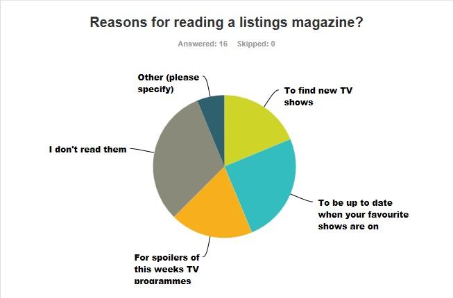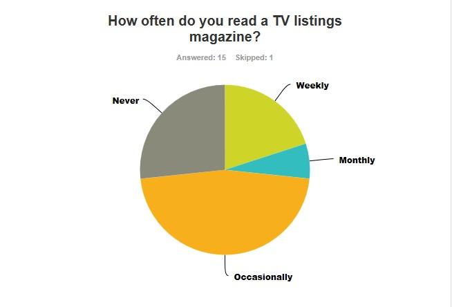 It came as a surprise that a reasonable number of people read TV listings magazines weekly, but as expected the two biggest chunks were the ‘occasionally’ and ‘never’.