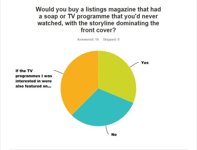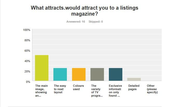 The 5th question helps us to determine what would/does attract people to a listings magazine, and the highest answer from the survey takers was “the main image” with the same number of people voting for “the easy to read layout”, “colours used” “variety of TV programmes” and “exclusive information only found in this magazine”. We will ensure we focus on these areas.