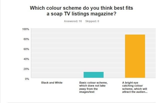 Following this, a large majority voted for a bright eye catching colour scheme, whilst a small minority voted for a basic colour scheme. We will look more into this before we create the magazine, but from the results we received, it is likely that we will opt for at least one bright colour which will attract an audience.
