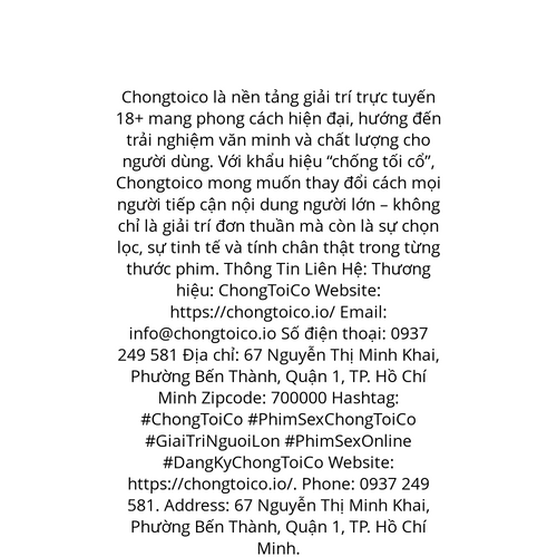Website: https://chongtoico.io/. Chongtoico là nền tảng giải trí trực tuyến 18+ mang phong cách hiện đại, hướng đến trải nghiệm văn minh và chất lượng cho người dùng. Với khẩu hiệu “chống tối cổ”, Chongtoico mong muốn thay đổi cách mọi người tiếp cận