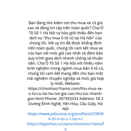 Website: https://chootoso1hanoi.com/thu-mua-xe-o-to-cu-tai-ha-noi-gia-cao-thu-tuc-nhanh-gon.html Bạn đang tìm kiếm nơi thu mua xe cũ giá cao và đáng tin cậy trên toàn quốc? Chợ Ô Tô Số 1 Hà Nội tự hào giới thiệu đến bạn dịch vụ "thu mua ô tô cũ tại H