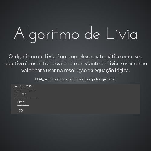 O algoritmo de Livia é um complexo matemático onde seu objetivo é encontrar o valor da constante de Livia e usar como valor para usar na resolução da equação lógica.