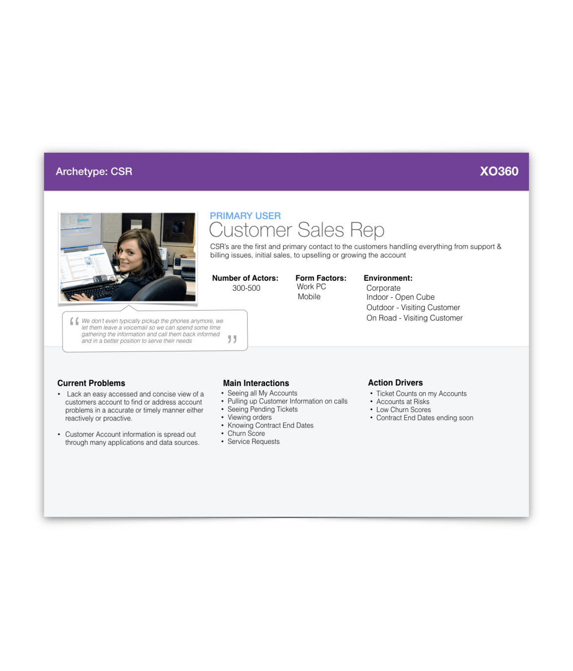 I traveled with the small team to XO offices in Nashville, TN where the CSR's are based where I facilitated a series work shadowing sessions, design thinking workshops, and contextual interviews to get in-person insights and to start building stakeholder trust for the UX Design Process