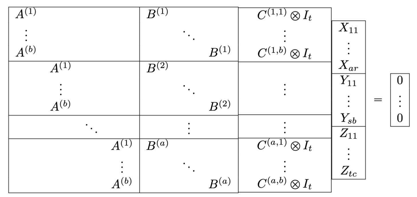 The naive \(abc\) rows by \(ar + bs + ct\) variables system is laid out by \( (I_a \otimes [\rho]) \text{Vec}(X) + \Pi_{a,b}(I_b \otimes [\sigma]) \text{Vec}(Y) = ([\tau] \otimes I_c) \text{Vec}(Z)\), where \( \Pi_{a,b}\) permutes an element in \(K^{bac \times bs}\) to \(K^{abc \times bs}\).